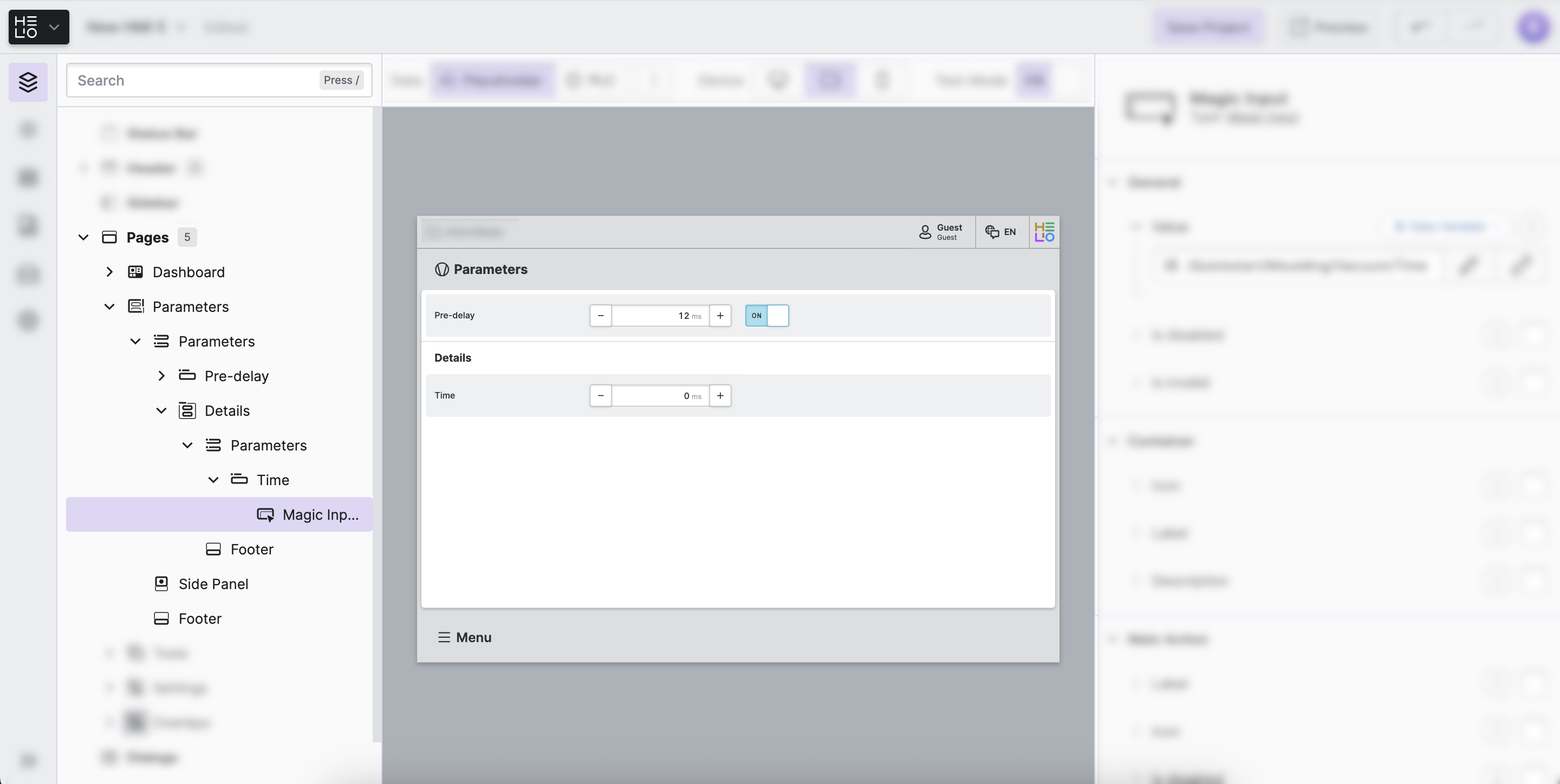 Go ahead and add a "Time" parameter to your new group. Next, add a Magic Input element within this new "Time" parameter to let our operators edit the Quickstart > Moulding > Vacuum > Time variable.