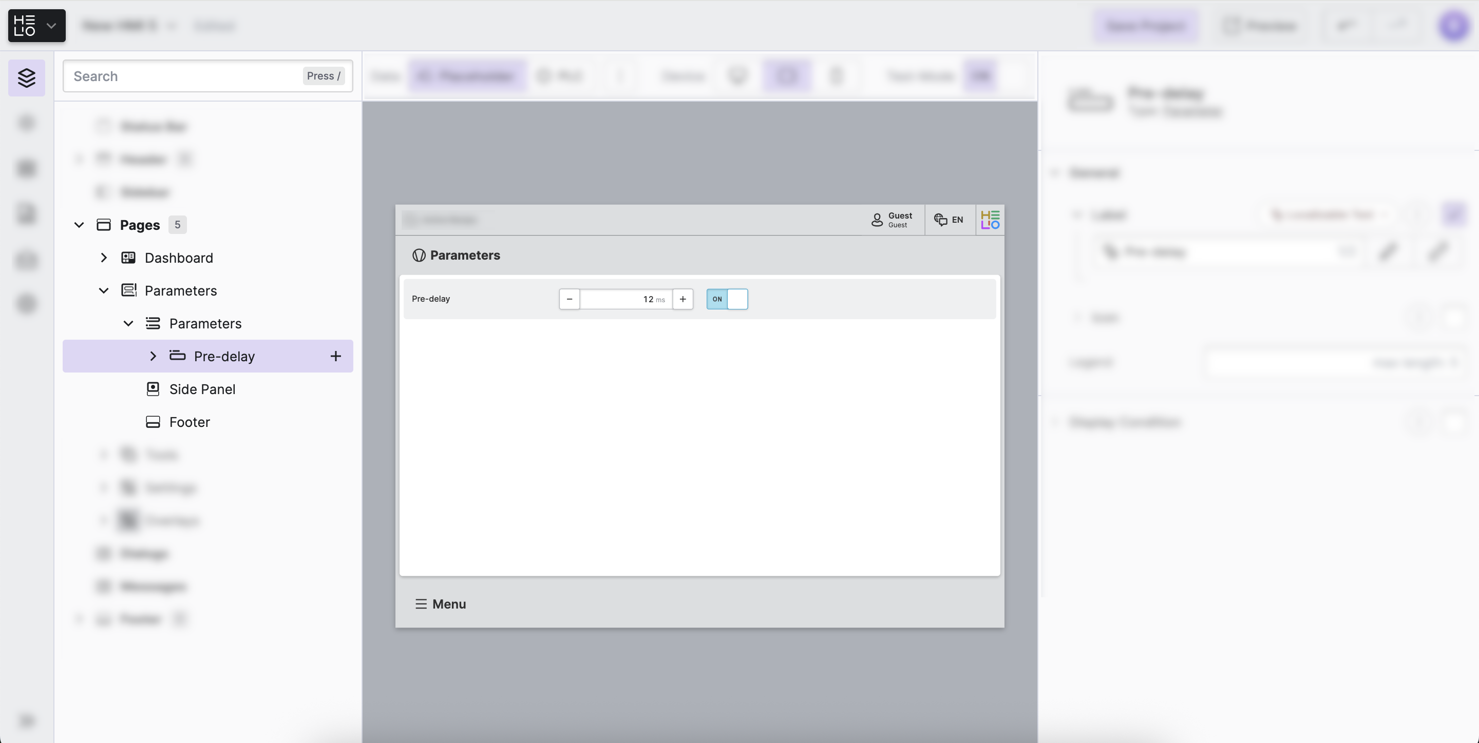 Within this parameter, we want our operators to be able to edit the the Quickstart > Moulding > Vacuum > PreDelay variable. For this case, our UX experts have chosen to use a numeric stepper, so let's add it: