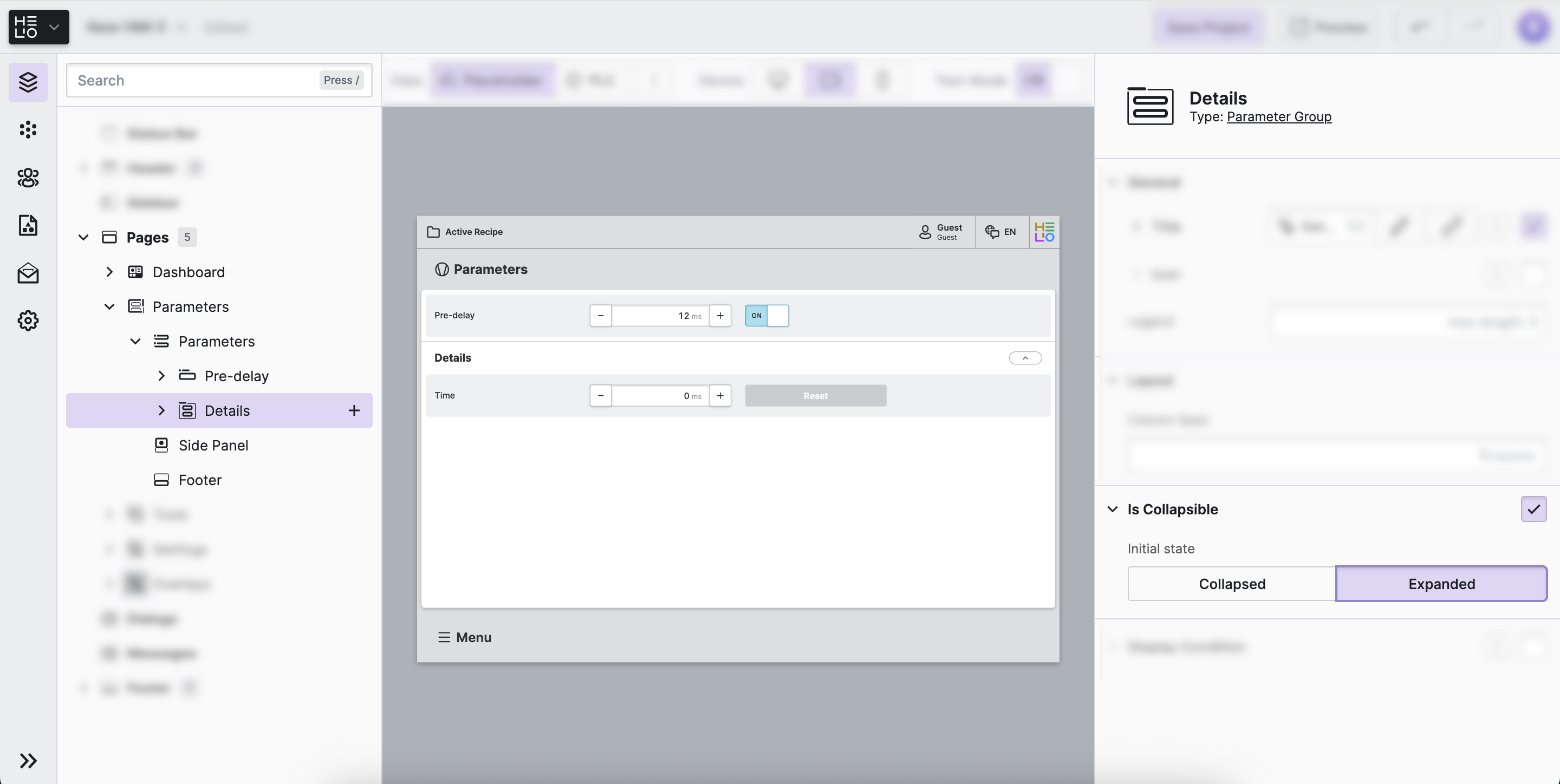 Our operators won’t need to edit these details all the time, so we want to safe some space on the parameter page and make this group collapsible.