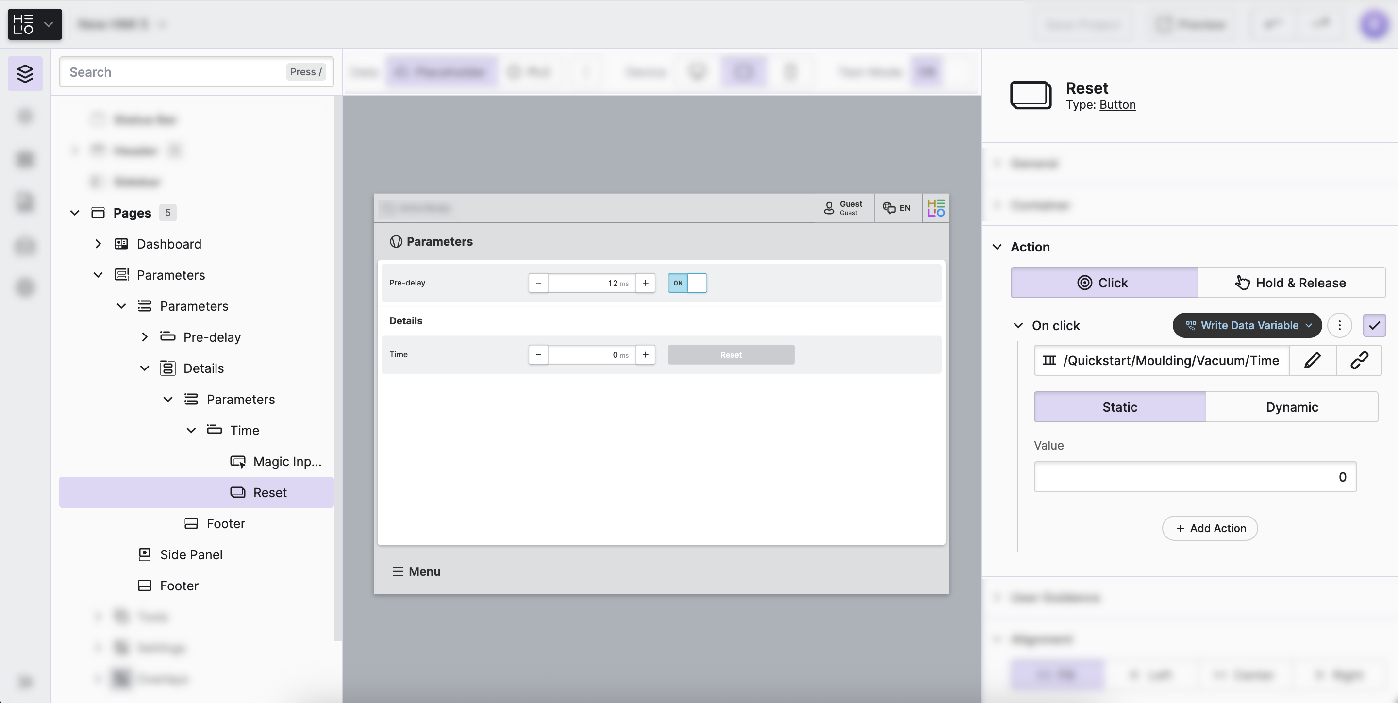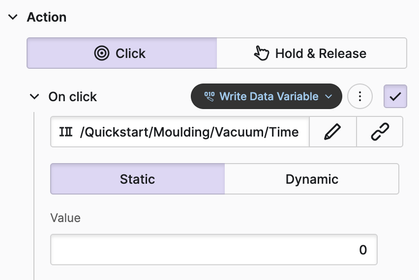 Now you can choose to which value you would like to set the "Time" variable when an operator clicks the "Reset Time" button. Since we always want to reset the variable to the same value, we will choose the Static option and set it to "0". And you’re done!