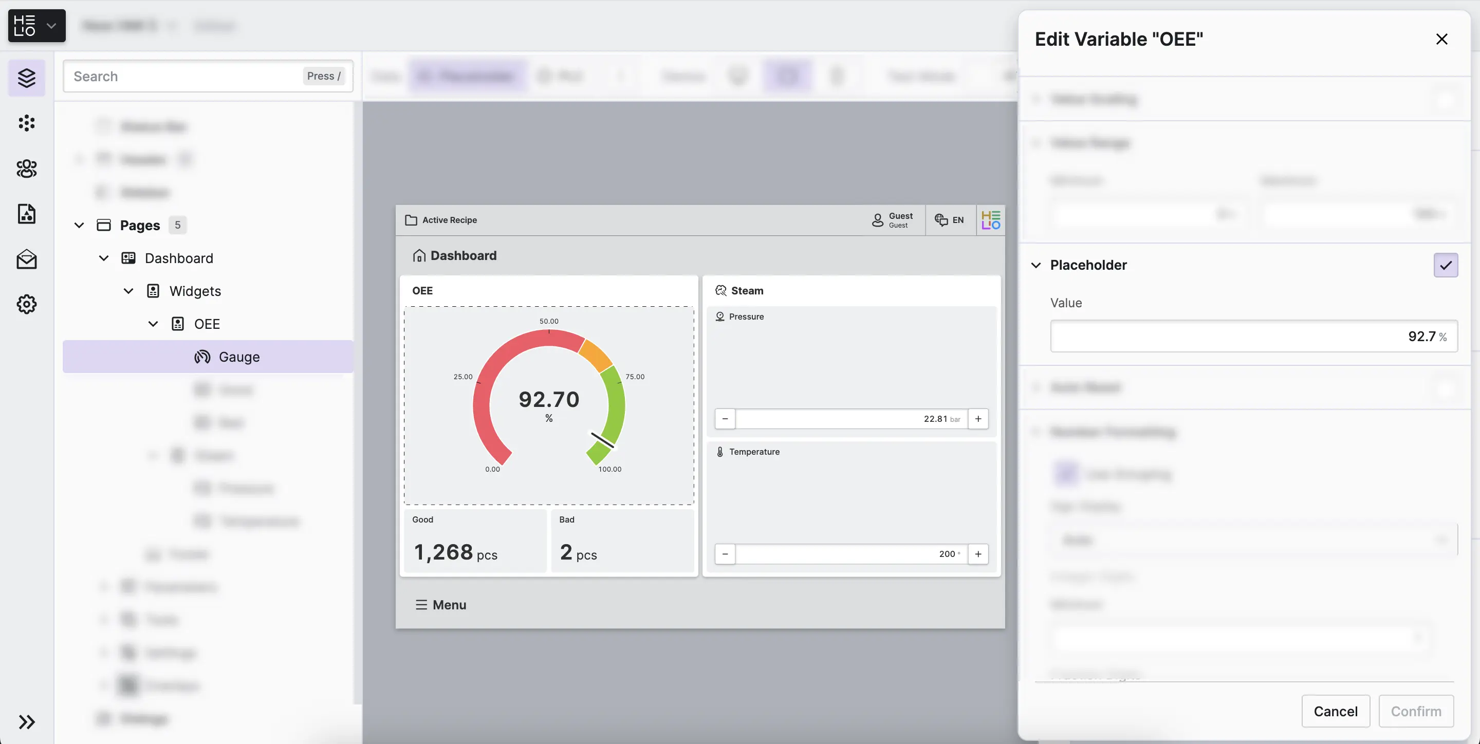 Our Placeholders are great, but we want to know what our OEE-Gauge would look like if it was in a critical range. So, let's edit the Placeholder of our OEE variable.
