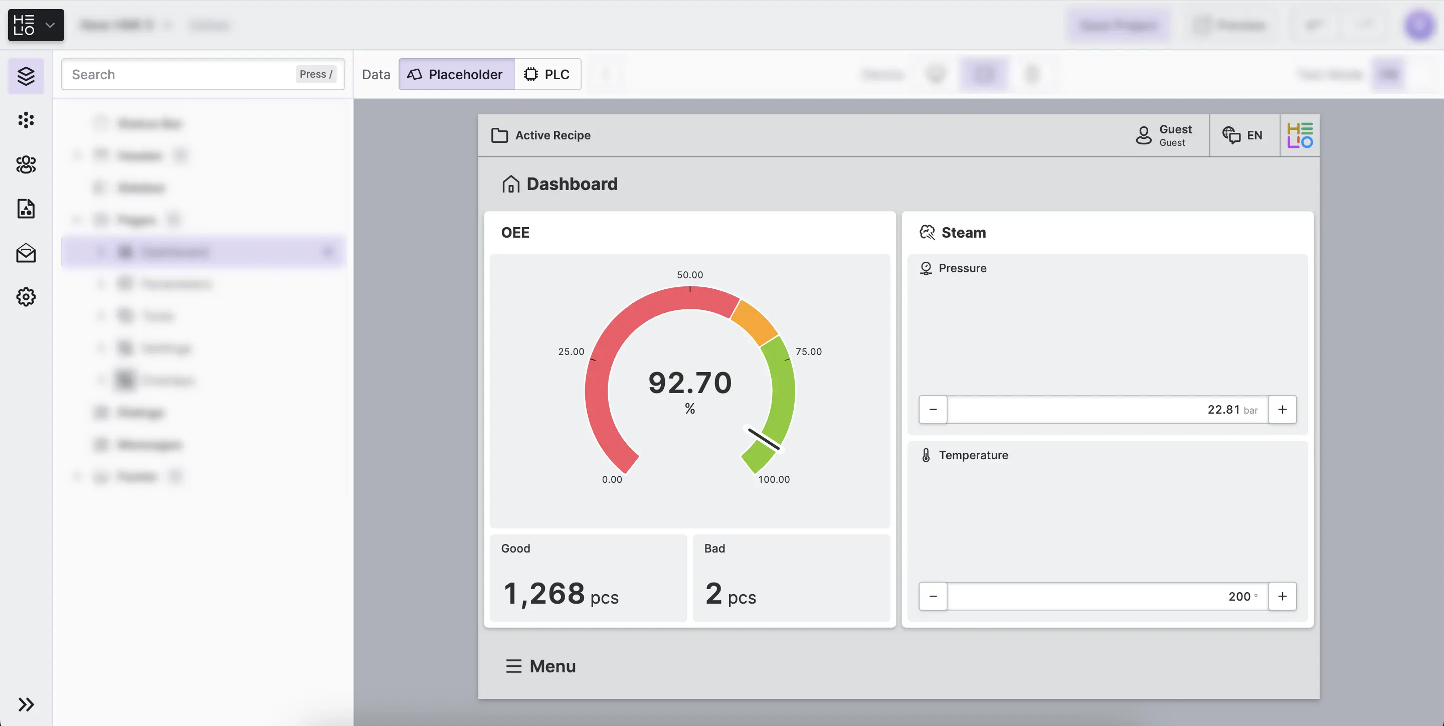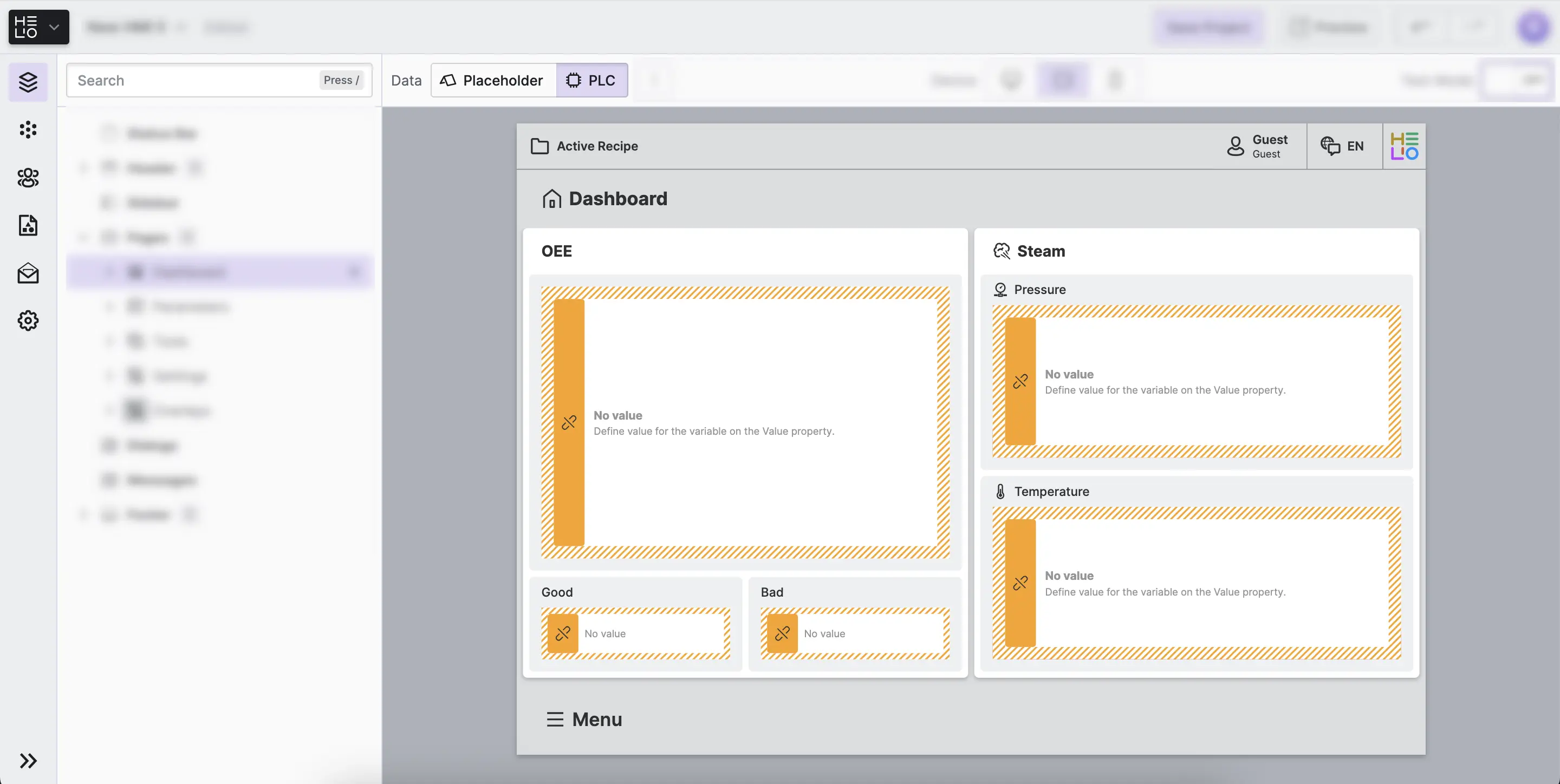 You may often need to work on an HMI without access to the actual PLC. However, you still want to be able to view the pages and elements of your HMI as if they were populated with data. Placeholders let you define fallback values that will be displayed when Placeholder Mode is active.