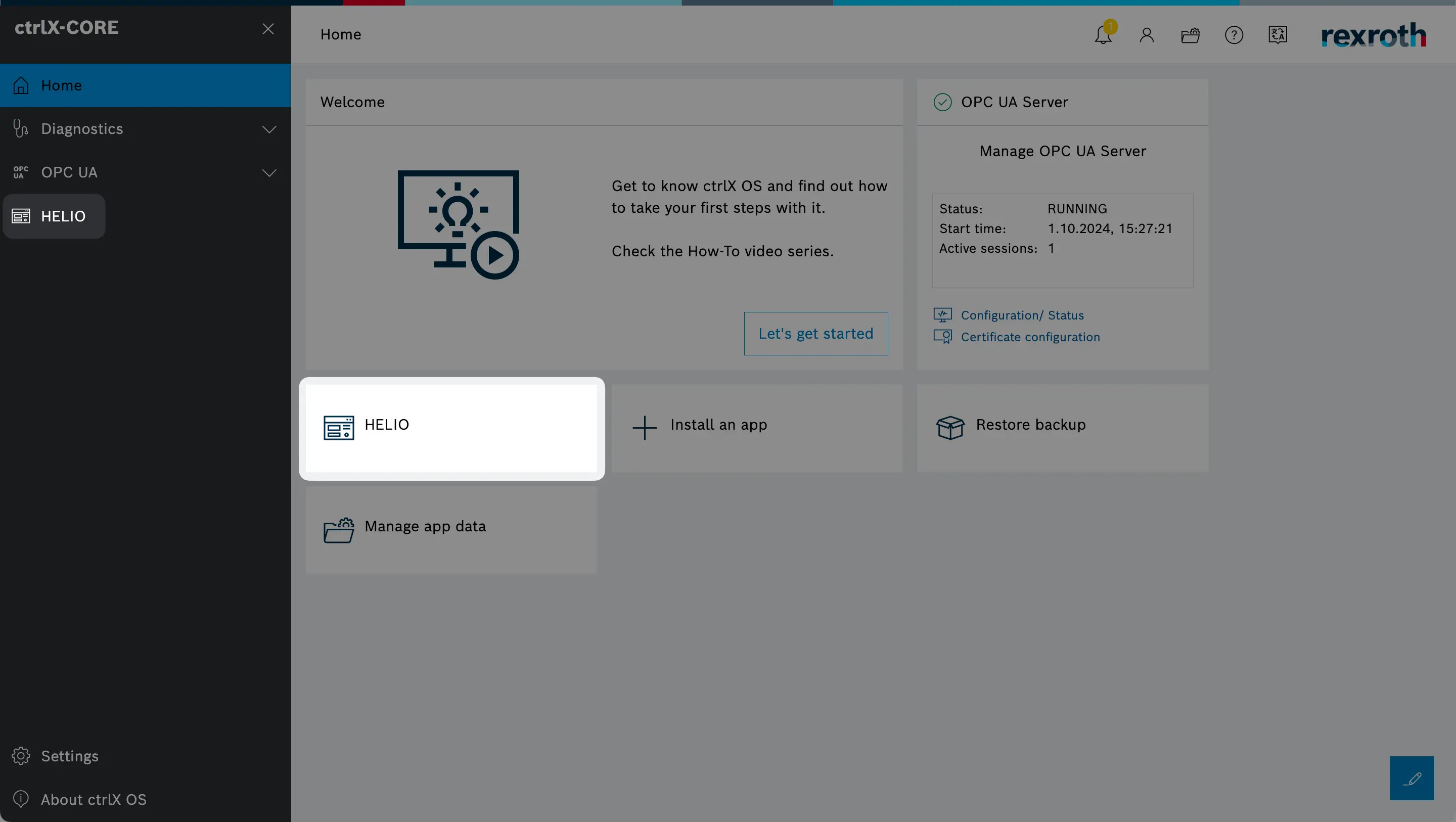 When installing the HELIO app on your ctrlX OS device, the operating system will make sure to automatically start HELIO for you.