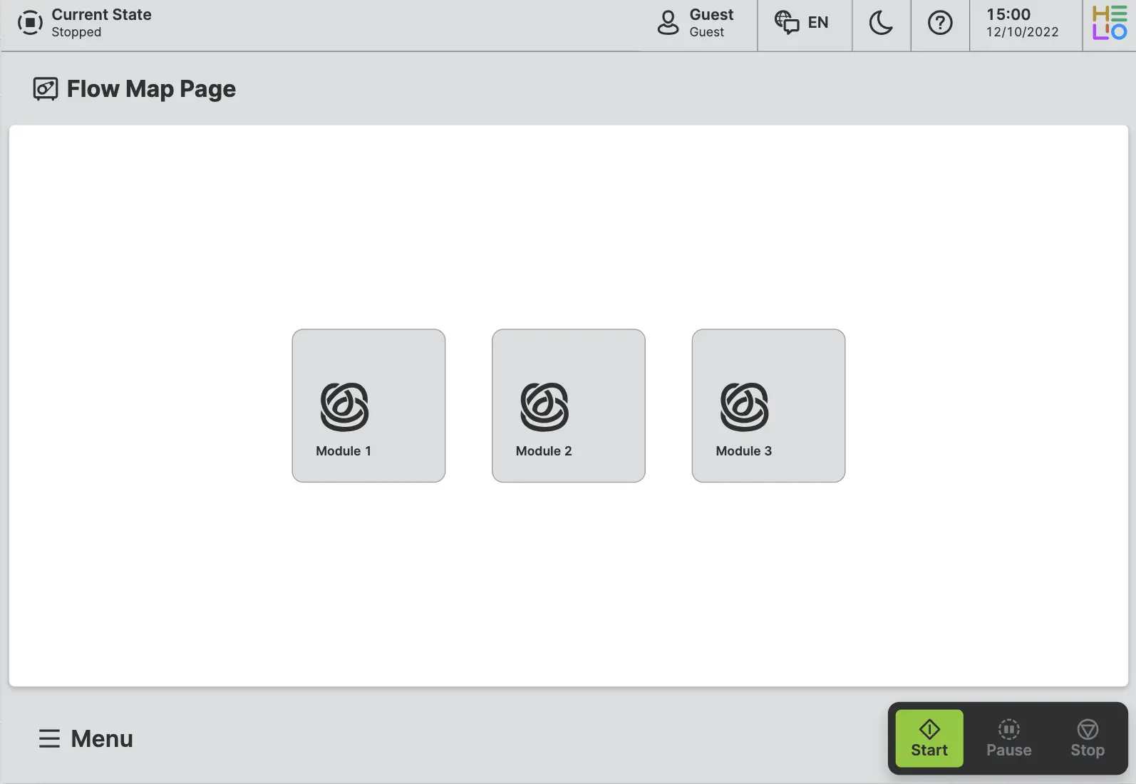 Switch to the Content View of the HELIO IDE and add a Flow Map Page to your HMI. HELIO will create a new page for you with three Flow Map Modules: