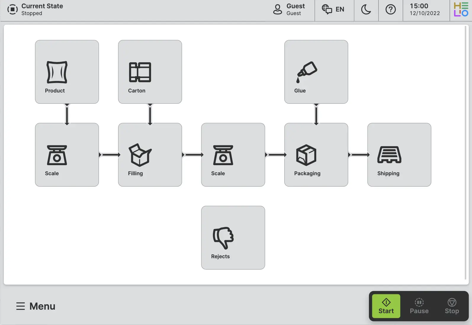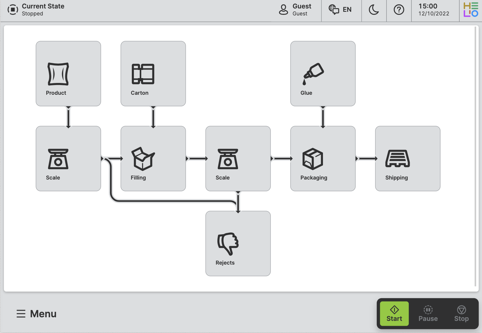 - We'll set up a packaging line workflow where products go through weighing, packaging, and shipping stages.
