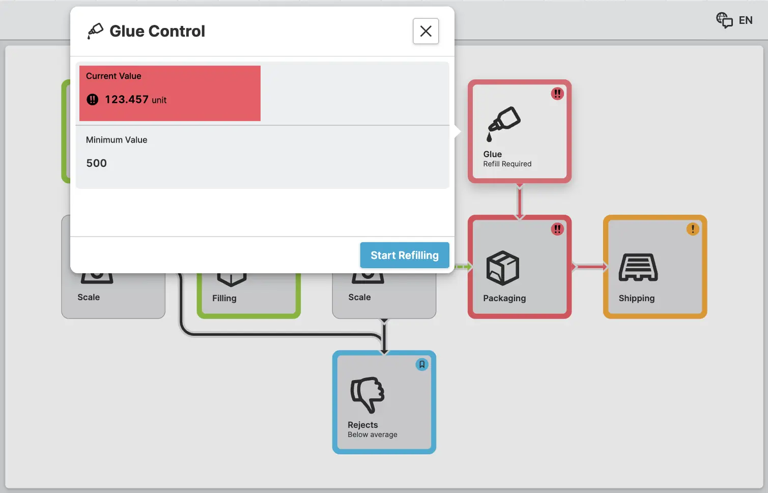 Now, our page displays all the parts of our machine and the flow direction within. However, there is still something missing. Let's bring our flow map to life by adding data and statuses.