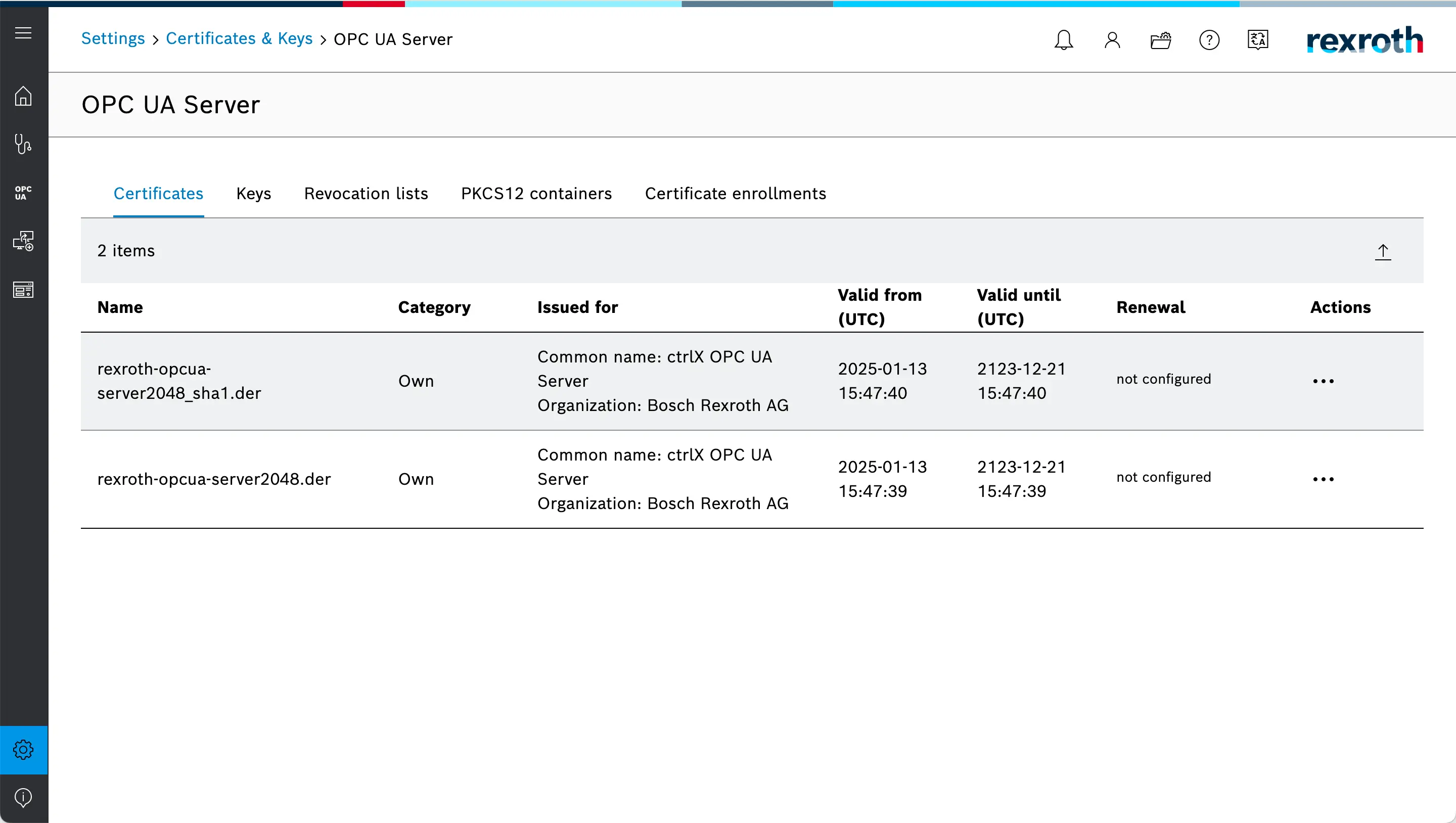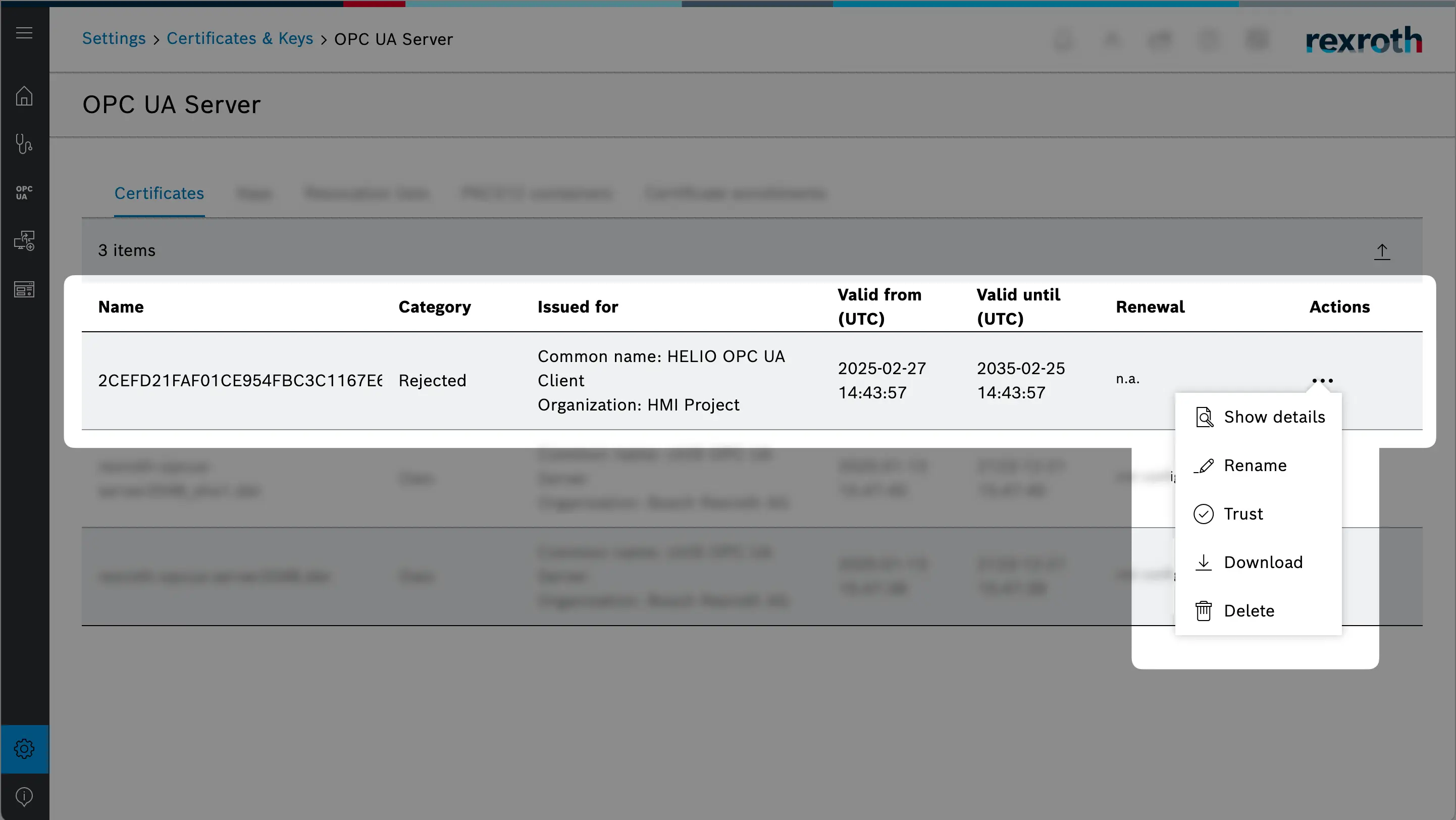 First we are going to switch to the ctrlX Web Interface and make sure to trust HELIO's Application Instance Certificate. The list of certificates should now look something like this: