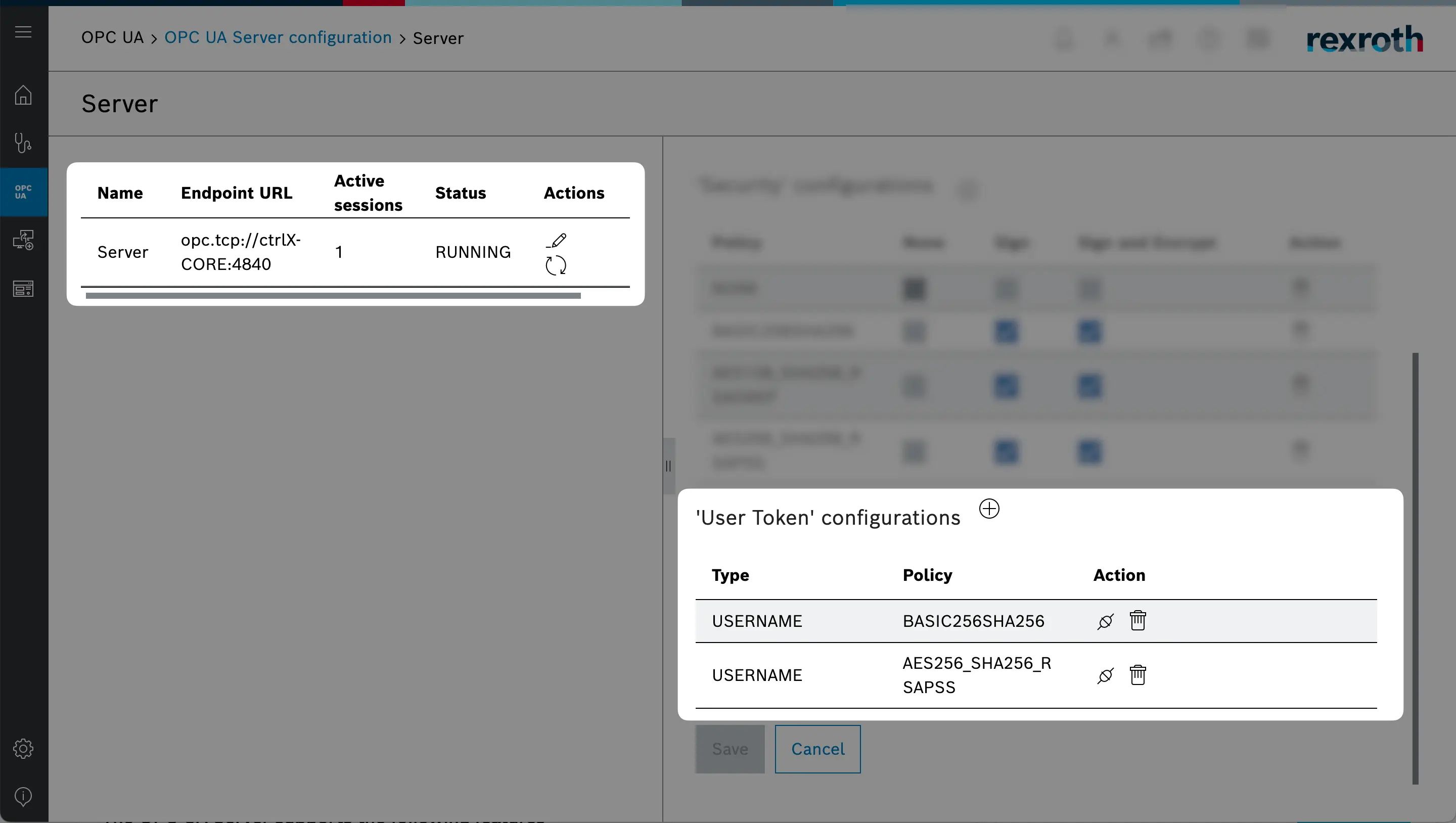 In the ctrlX Web Interface, the OPC-UA Server display an Endpoint URL