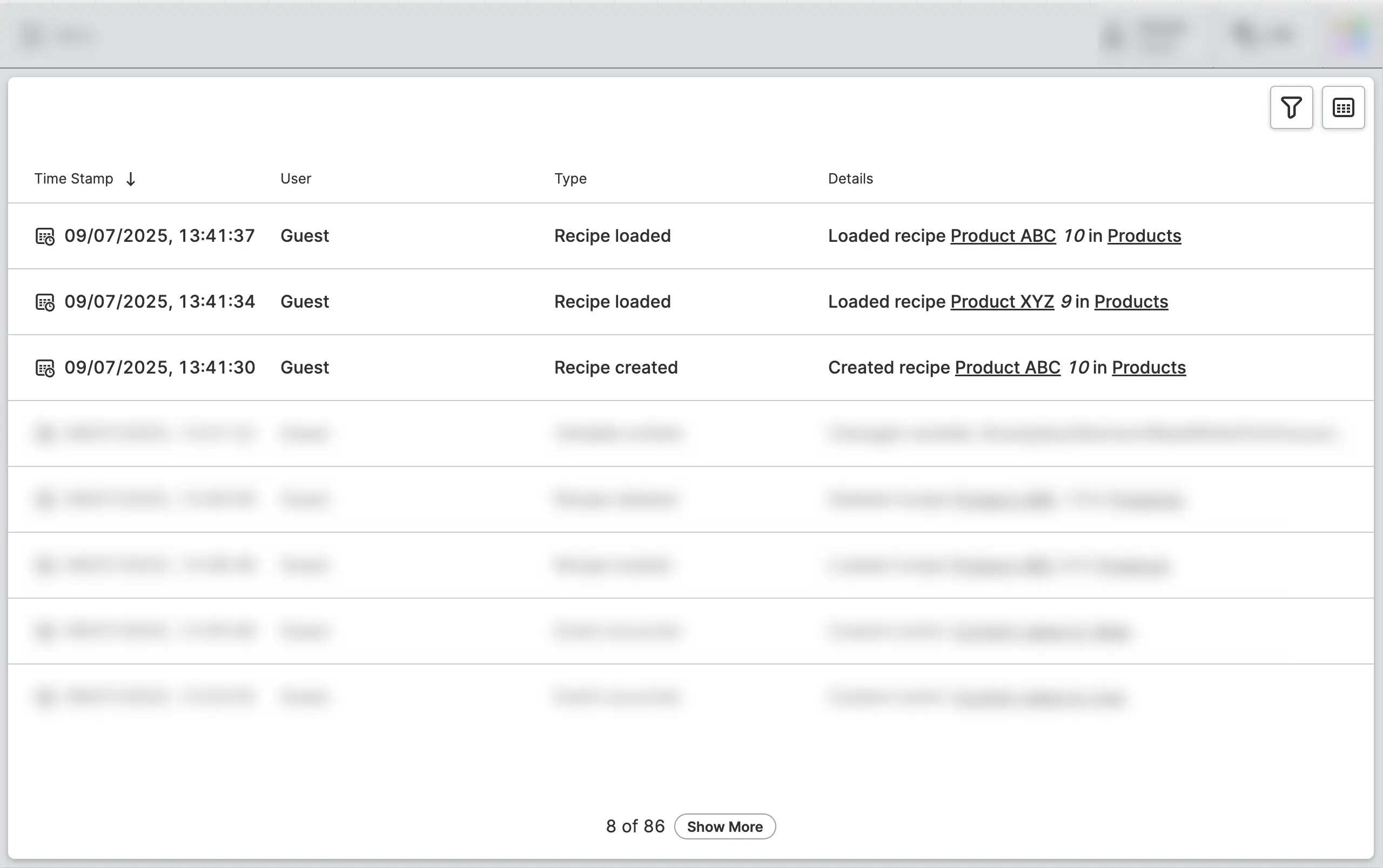 After recording some events, we can navigate to the Audit Trail Page, which will now contain our additional recipe events.