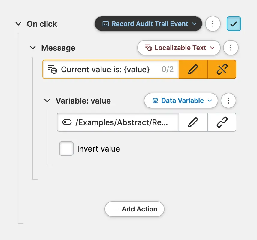 Placeholderinto the Localizable Text. In this case we are inserting the value of a Data Variable (Dynamic Property). - As a result the actual message that will be recorded to the database will be: