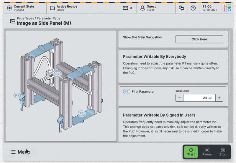 ReferenceActionsNavigationShow Main Navigation ActionOn this pageShow Main Navigation Action About Use this action to open the main navigation of the HMI. Examples Show Main Navigation from the Footer or within a Page In this example, the main navigation is opened first via a button within the footer of the HMI and second via a button within a page of the HMI. Related ElementsFooter ButtonMenu Button