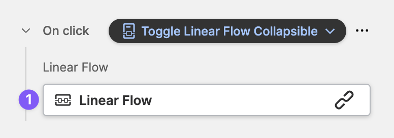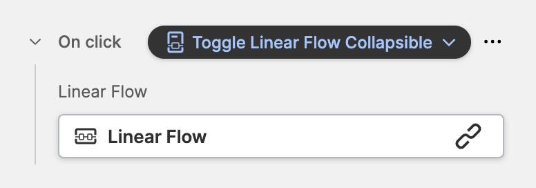 ReferenceActionsOtherToggle Linear Flow CollapsibleOn this pageToggle Linear Flow Collapsible About Toggle all collapsible modules of a linear flow to collapse or expand. Anatomy Linear FlowSelect the linear flow of which all collapsible modules should be toggled. Related ElementsLinear FlowLinear Flow GroupLinear Flow Module