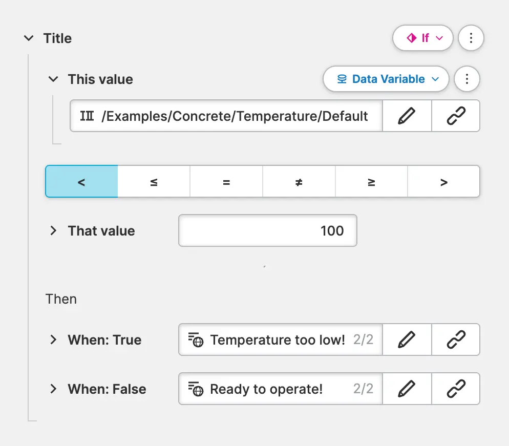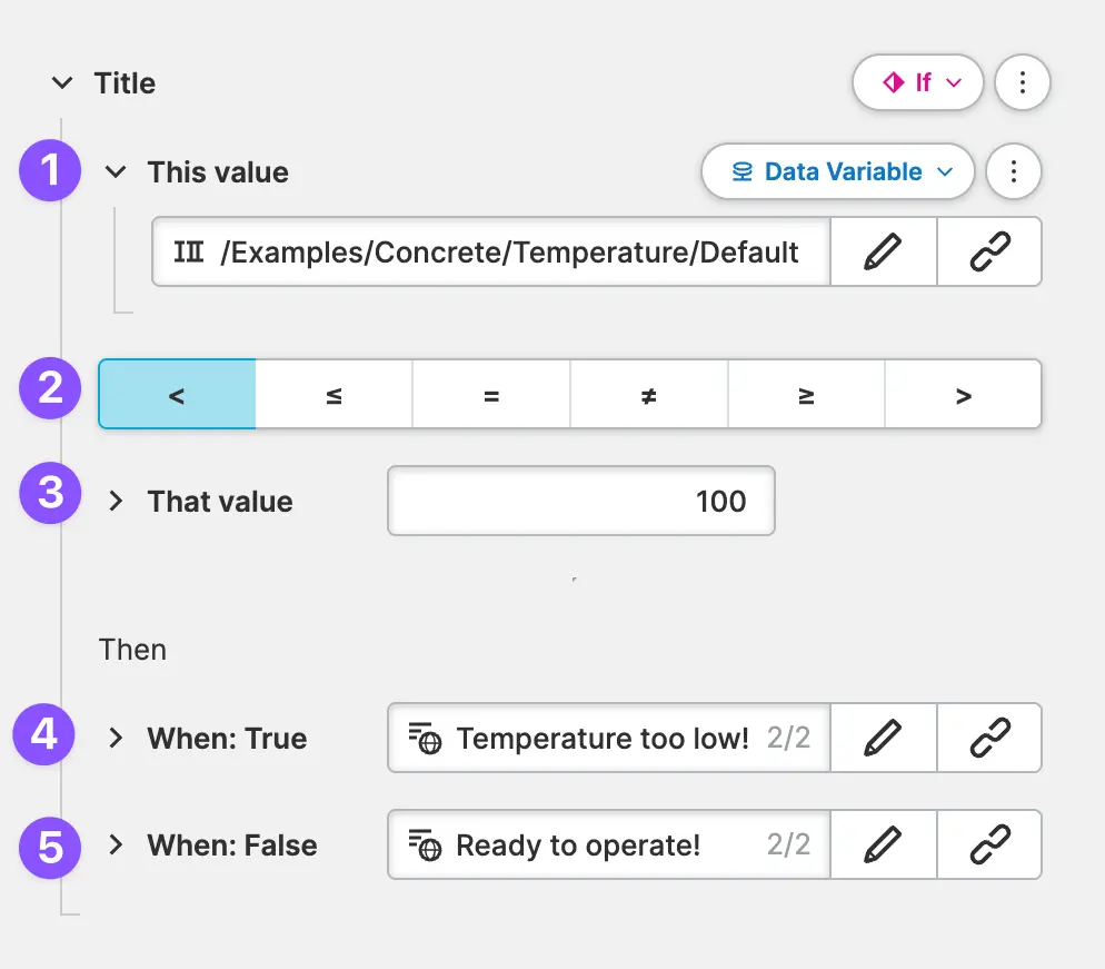 If the comparison turns out to be truthy this value will be used as the actual value. By default, the value istrue. However, as this property is dynamic, you can use any type you prefer, such as a Data Variable (Dynamic Property) or a Localizable Text.When: False